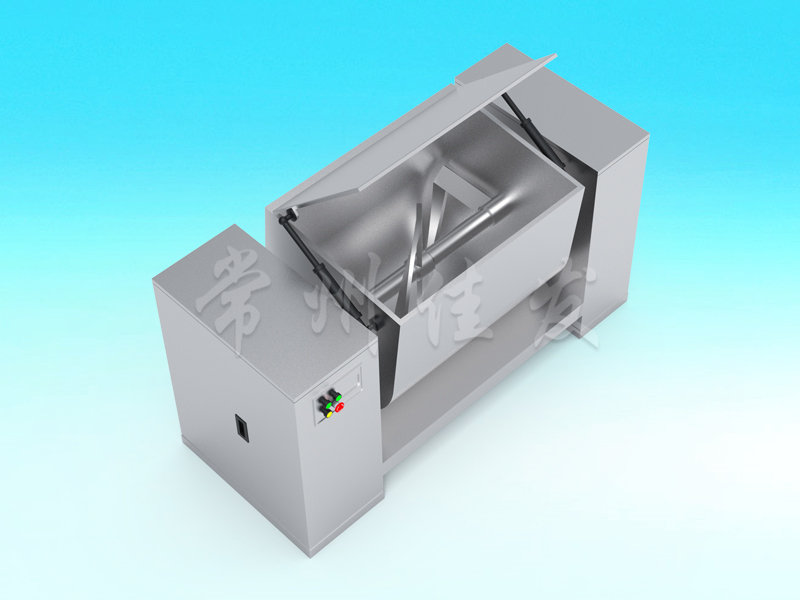 該機通過機械傳動,使不對稱的V型圓柱體內的物料做往復翻動,達到均勻混合之目的。